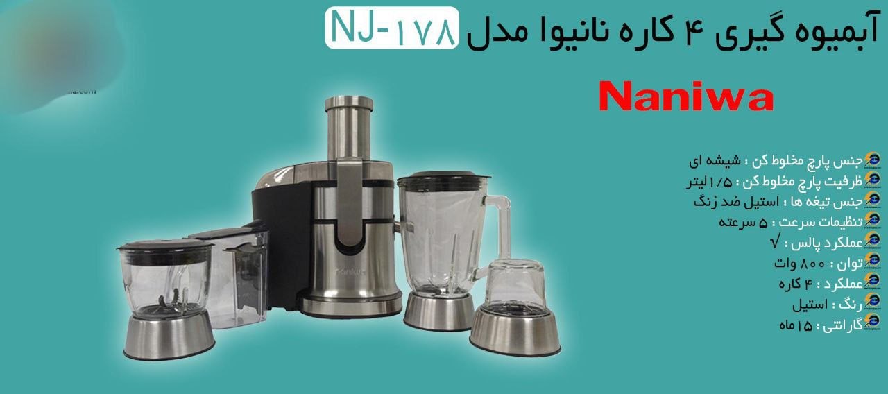 آبمیوه گیری چهارکاره نانیوا مدل NJ-178 توان موتور: 800 وات پرقدرت مخزن تخلیه تفاله: دارد پارچ مخلوط کن: شیشهای پنل کنترل: لمسی دیجیتالی جنس بدنه، تیغه و پایهها: استیل ضدزنگ نوع عملکرد: آبمیوهگیری، مخلوطکن، آسیاب و خردکن مناسب برای: خانهها، کافههای کوچک و مهمانیها