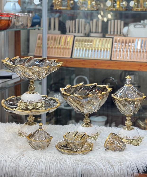 ۴تیکه اصلی+ ۶عدد پیاله+ ۶عدد پیش دست+ ۶عدد فنجان+ ۱عدد قندان میباشد