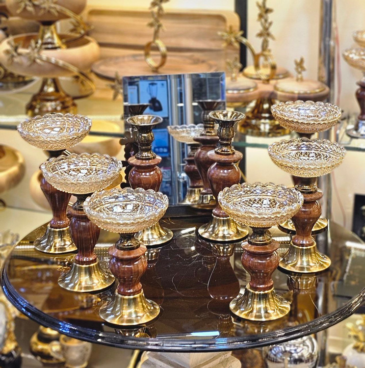 این هفتسین نفیس، تلفیقی هنرمندانه از بلور تراشخورده، فلز براق و پایههای چوبی است؛ ترکیبی که حس اصالت، گرما و شکوه را همزمان به سفره نوروزی شما میبخشد. درخشش بلورهای ظریف در کنار فلز صیقلی و بافت طبیعی چوب، جلوهای ماندگار و اشرافی خلق کرده است.