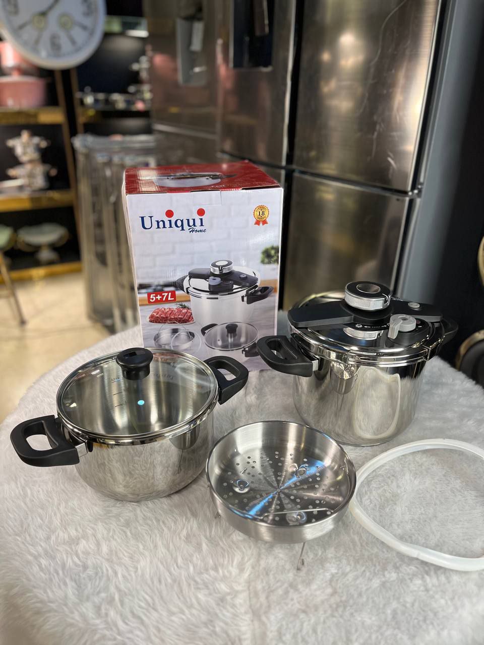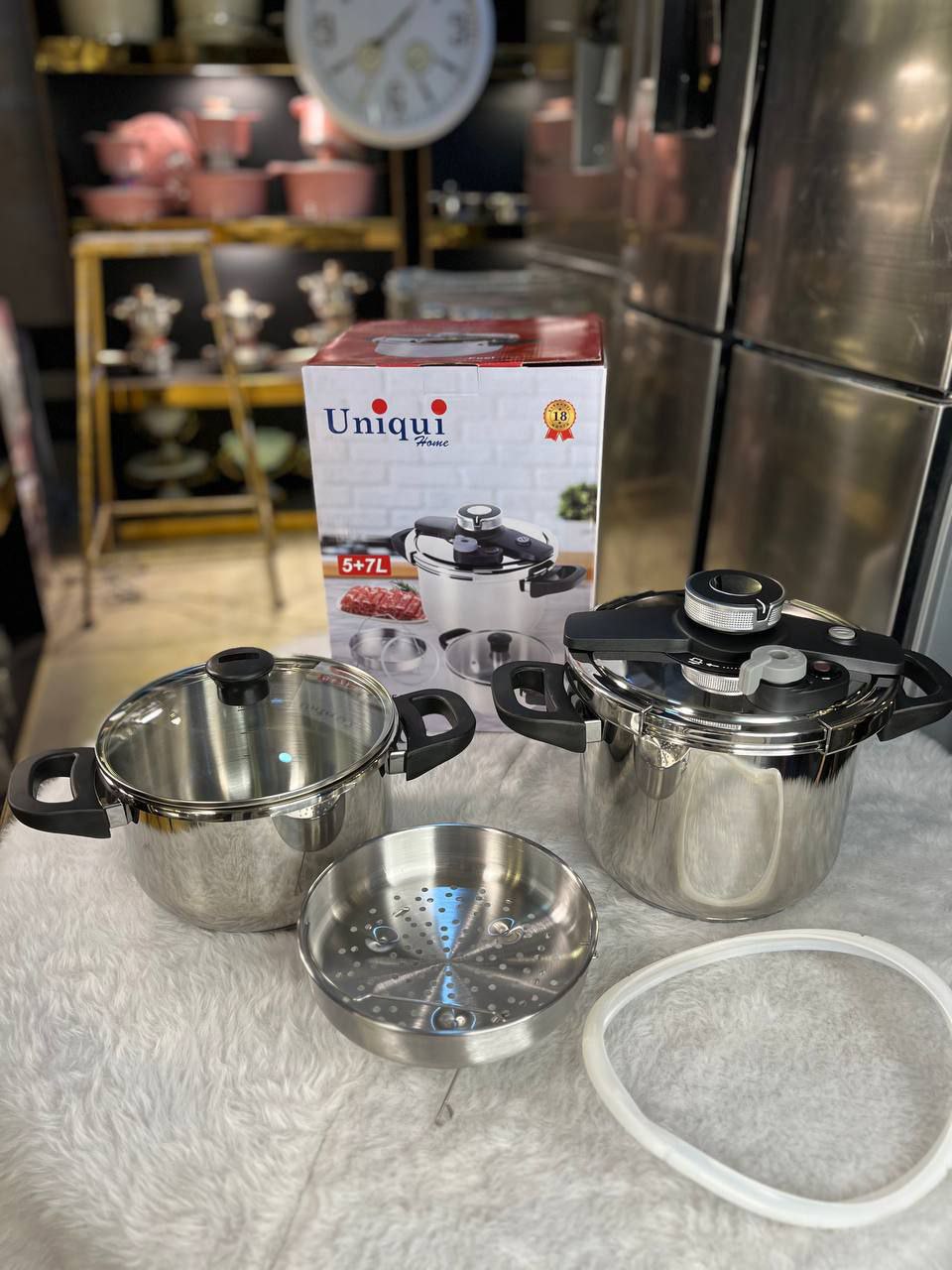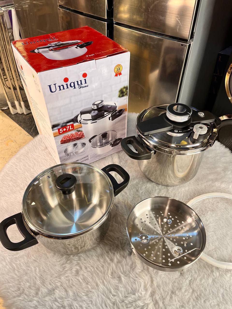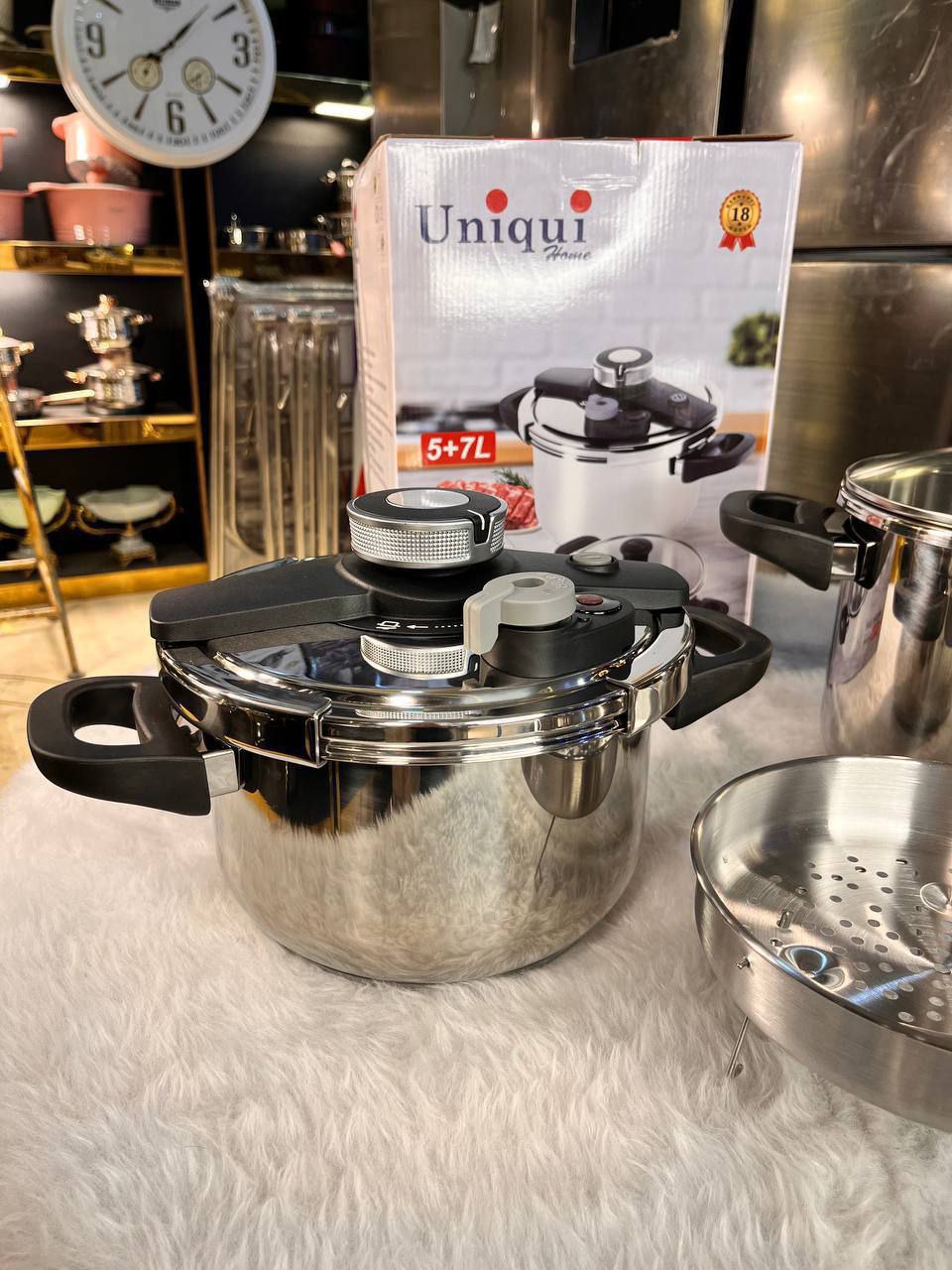 جنس استیل ضد زنگ دارای ۲ درب زودپز و پیرکس مناسب برای پخت سریع و آسان غذا با حفظ طعم و خاصیت آن همراه با سبد بخارپز، روشی سالم و مغذی برای پخت غذا